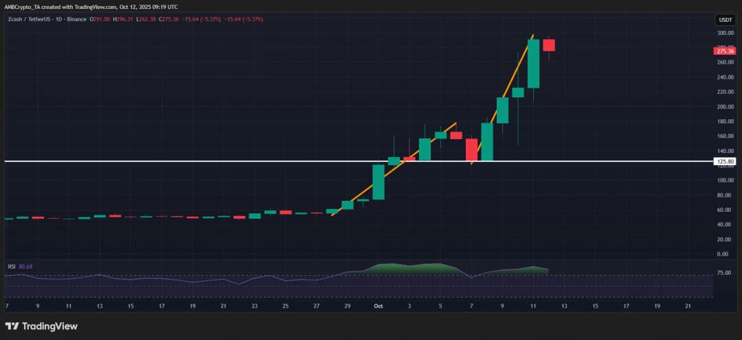 با این حال، شاخص قدرت نسبی RSI در زمان نگارش بالای 85 باقی ماند که نشان می دهد ZEC در منطقه اشباع خرید عمیق قرار دارد. به زبان ساده، مومنتوم بیش از حد داغ شده و چنین شرایطی اغلب اصلاحات کوتاه مدت را برمی انگیزد چون خریداران اولیه در نزدیکی مقاومت ها سود کسب می کنند. در واقع، اصلاح قیمتی 4.7% در حین روز تا 277 دلار آمریکا با فاز سرد شدن کلاسیک همخوانی داشت. با این وجود، عمق سفارشات خرید ZEC در تایم فریم های پایین قوی باقی ماند که نشان می دهد خریداران از حمایت دفاع می کنند. اگر این حمایت حفظ شود، ZEC می تواند مجدداً مومنتوم به دست آورد و در هفته آینده تلاش برای شکست بالای سطح 300 دلار آمریکا داشته باشد.