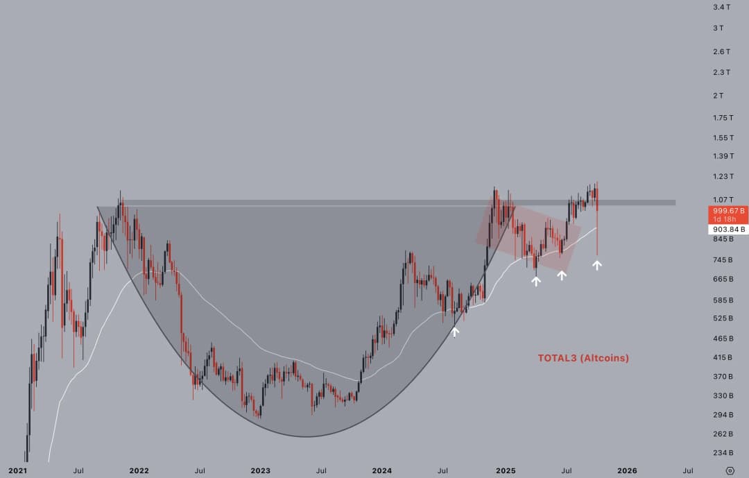 در یک پست در X، تحلیلگر Jelle اشاره کرد که ارزش بازار آلتکوینها به دلیل نوسانات اخیر یک فتیله بزرگ تجربه کرد، اما ناحیه 1.05 تریلیون دلاری بهصورت قاطع از دست نرفته است. این احتمال وجود دارد که این سطح بازپسگیری شود که در این صورت نشانهای از حرکت برگشتی بازار آلتکوینها خواهد بود.