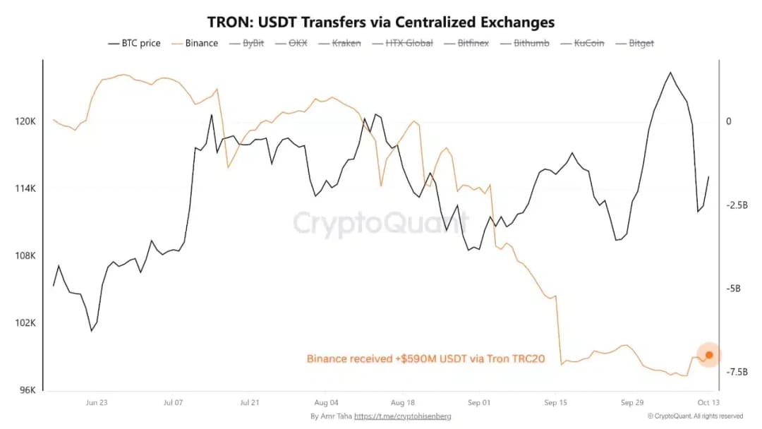 در حالی که لیدر بازار با سطح مقاومت محلی دست و پنجه نرم می کرد، تحلیلگران ورود پیوسته سکه های پایدار به صرافی ها را در روزهای اخیر مشاهده کردند. در پستی در CryptoQuant Insights، کاربر Amr Taha اشاره کرد که Binance شاهد ورود 590 میلیون دلار آمریکا Tether از طریق شبکه TRON [TRX] بوده است، شبکه مورد استفاده برای تسویه شدن سکه های پایدار. این ورود ها همزمان با عبور قیمت بیت کوین از مرز 115 هزار دلار آمریکا بود و نشان دهنده افزایش توان خرید در بازار بود.