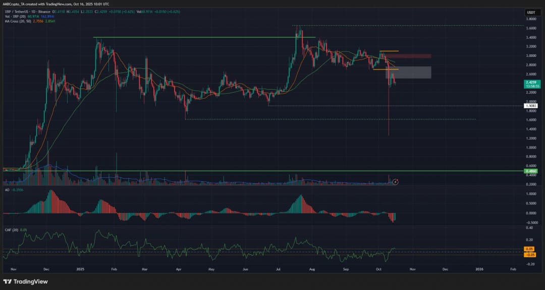 دلیل این وضعیت این است که خریداران XRP از محدوده تقاضای 2.7-2.8 دلار در برابر تست های نزولی از ژوئیه دفاع کرده بودند، اما فشار فروش اخیر قیمت را مجبور کرد تا زیر این حمایت بشکند. این شکست باعث ایجاد یک بی تعادلی بزرگ شد که با جعبه سفید نشان داده شده است. این ناحیه از 2.5 تا 2.77 دلار مانعی قوی برای خریداران به حساب می آید.