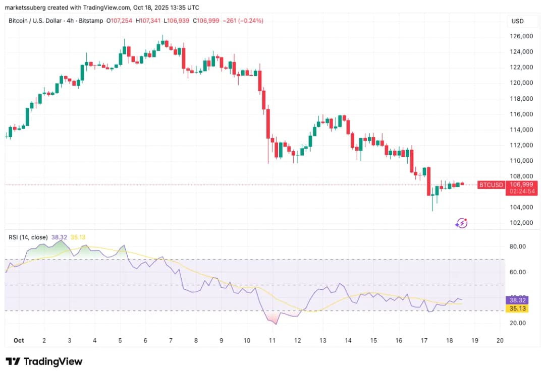 همانطور که Cointelegraph گزارش داد، یک نشانه دلگرم کننده دیگر برای بیت کوین در قالب مقادیر شاخص قدرت نسبی (RSI) نمایان شد. RSI روزانه در پایین ترین سطح از ماه آوریل بود، زمانی که BTC/USD تا 75,000 دلار آمریکا سقوط کرد، و نمودار چهار ساعته یک واگرایی صعودی واضح را نشان می داد. در حالی که قیمت کف های محلی جدید می ساخت، RSI کف بالاتری را ثبت می کرد که نشان داد فشار فروش زیر مرز 110,000 دلار آمریکا در حال کاهش است.