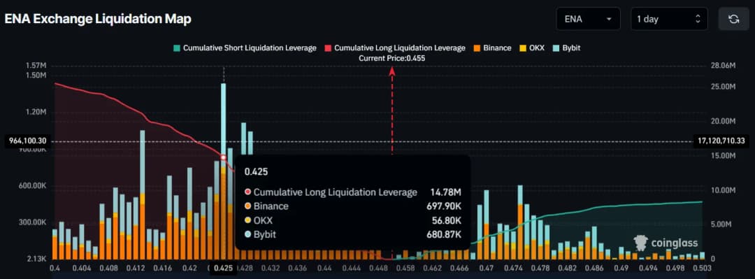 در همان دوره، معاملهگران علاقهمندی بالایی به موقعیت های لانگ (خرید) نشان دادهاند. در زمان انتشار، سطوح عمده لیکوئید شدن ENA در سمت پایین ۰.425 دلار و در سمت بالا ۰.475 دلار قرار دارند، که در این سطوح ۱۴.۷۸ میلیون دلار موقعیت های لانگ (خرید) و ۴.۹۵ میلیون دلار موقعیت شورت ساخته شده است.