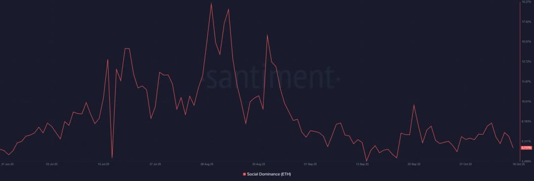 سلطه اجتماعی اتریوم تا زمان نگارش این مطلب به ۵.۱۷٪ ریزش کرده است که نشان می دهد گفت و گوهای بازار درباره ETH علیرغم فشار قیمتی اخیر در حال کاهش است. این افت نشان می دهد معامله گران خرد کمتر درگیر شده اند که معمولاً پیش نشانگر از دست رفتن شتاب حرکت صعودی است. به طور تاریخی، اتریوم در حفظ رشد قیمتی وقتی هیاهوی اجتماعی کاهش می یابد مشکل داشته، زیرا بخشی از تقاضای کوتاه مدت شبکه توسط همین فعالیت خرده فروشی هدایت می شود. علاوه بر این، عدم تطابق بین احساسات اجتماعی و قوت قیمت، ضعف در اعتماد معامله گران را آشکار می سازد. اگر این روند ادامه یابد، اتریوم ممکن است در معرض فشار قرار گیرد چون توجه گسترده تر به روایت های فعال تر آلت کوین ها منتقل می شود.