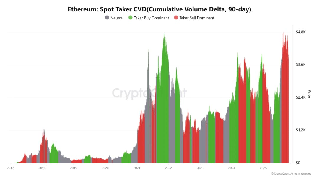 داده های Spot Taker CVD نشان می دهد سلطه فروش تیکرها وجود دارد و تأیید می کند فشار فروش در حال تشدید است زیرا معامله گران پس از رشد اخیر به شناسایی سود می پردازند. این تغییر نشان دهنده انتقال تدریجی توکن ها از معامله گران کوتاه مدت به خریدارانی است که دیرتر وارد رشد قیمتی شده اند. همراه با کاهش شاخص های اجتماعی و نسبت NVT بالا، این موضوع روایت اینکه روند صعودی اتریوم ممکن است به زودی با مقاومت روبرو شود را تقویت می کند. اگر فشار فروش تسریع شود، دارایی ممکن است در حفظ محدوده قیمتی کنونی مشکل پیدا کند، خصوصاً اگر جریان های سرمایه گذاران خرد کاهش یابد.