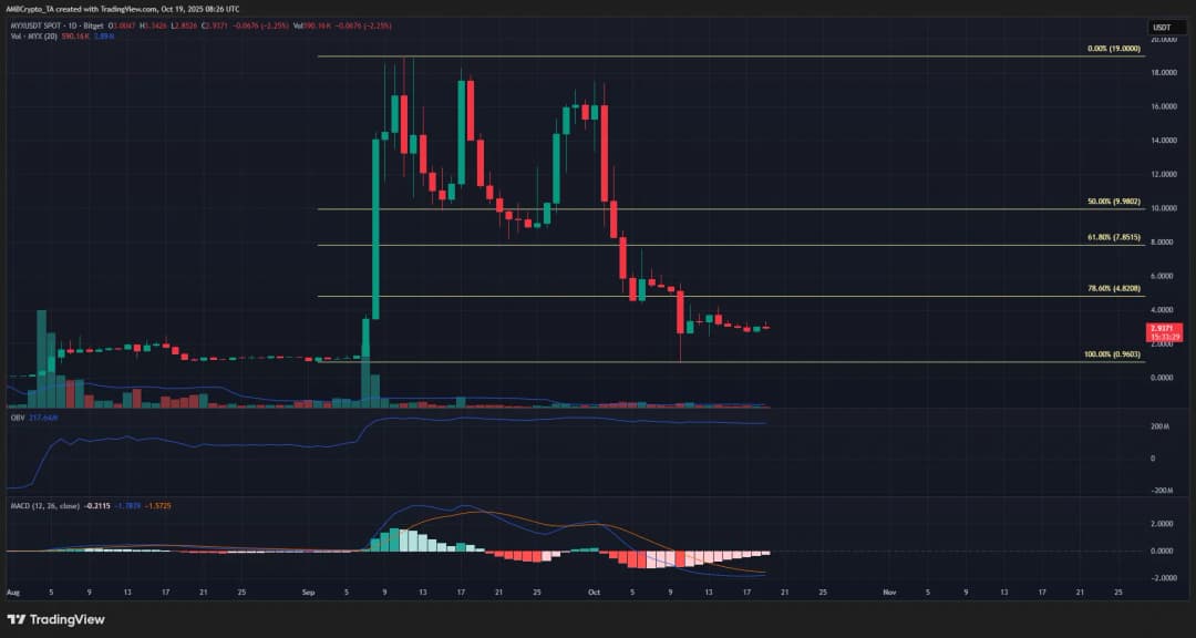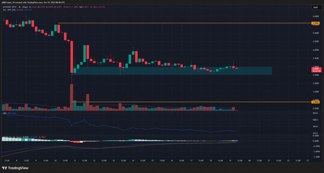 برای معاملهگران: این خبر مهم است چون نشان میدهد MYX تمام سود سریع قبلی را از دست داده و نیاز به تایید حجم و حرکت قیمت دارد تا وارد یک روند صعودی پایدار شود. سطوح کلیدی برای رصد عبارتند از: حمایت کوتاهمدت $2.5، مقاومت فوری $4.33 و عبور از $5.6 که میتواند چشم انداز را صعودی کند. همچنین افزایش حجم معاملات روزانه به بالاتر از میانگین و یک تقاطع صعودی MACD یا روند صعودی در OBV نشانههای مهم برای شروع حرکت برگشتی خواهند بود.