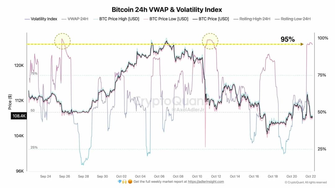 بازگشت قیمت در پی افزایش نوسان بیتکوین [BTC] رخ داد. تحلیلگر رمز ارز Axel Adler Jr مشاهده کرد که شاخص نوسان بیتکوین برای سومین بار در یک ماه بالاتر از 95٪ رفته است. این یک علامت هشدار بود که معامله گران باید منتظر حرکات قیمتی تند باشند.