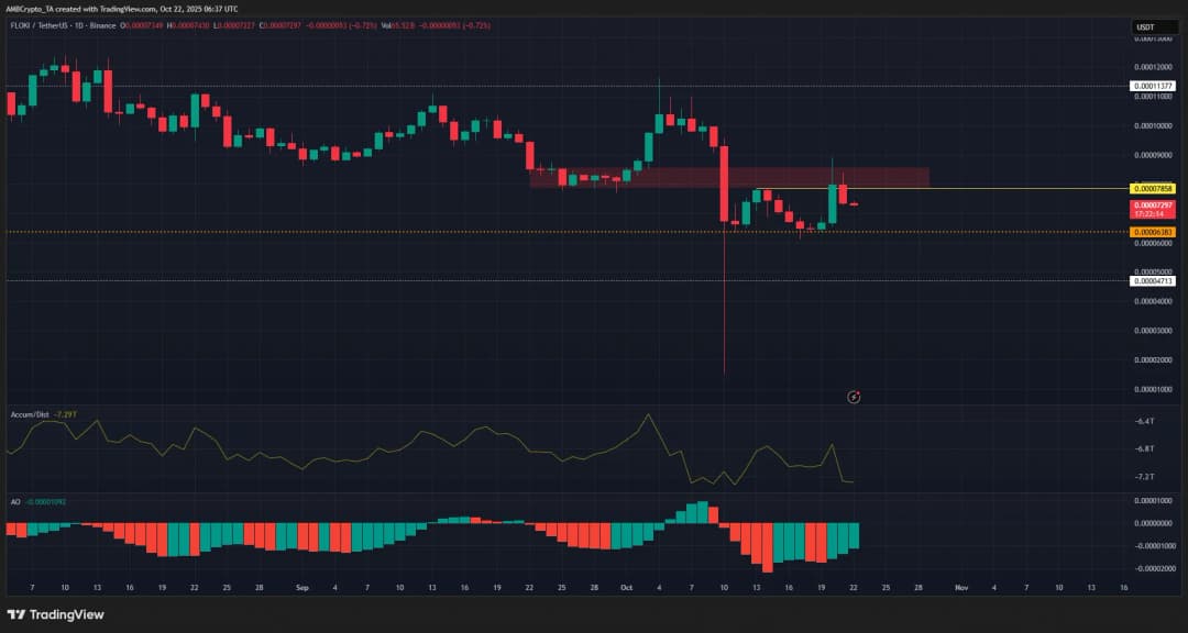 این موضوع به توضیح تله صعودی کمک میکند که FLOKI در 36 ساعت گذشته تجربه کرد. با وجود بازگشت قیمت از ناحیه عرضه در $0.0084، ساختار بازار FLOKI در چارت 1 روزه همچنان صعودی بود. این تغییر ساختار داخلی پس از نفوذ به سقف نوسانی محلی در $0.0000785 در رشد قیمتی دوشنبه رخ داد. با این حال، نوسانگر Awesome همچنان شتاب نزولی را نشان میداد. شاخص حجم A/D نشان داد که فشار خرید به اندازه کافی قوی یا مداوم نبوده تا از اینجا یک روند صعودی قطعی ایجاد کند. در حالی که تغییر ساختار داخلی یک نتیجه صعودی به شمار میآید، معامله گران نوسانی باید در باز کردن پوزیشن خرید محتاط بمانند.