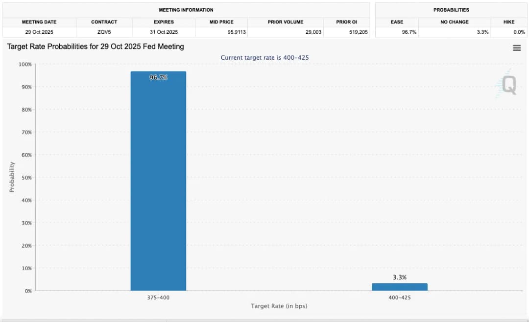 ابزار FedWatch شرکت CME Group که احتمالهای بازار در مورد حرکتهای نرخ بهره توسط فدرال رزرو را میسنجد، بهطور قاطع طرفدار کاهش 0.25% در تاریخ 29 اکتبر بود.
