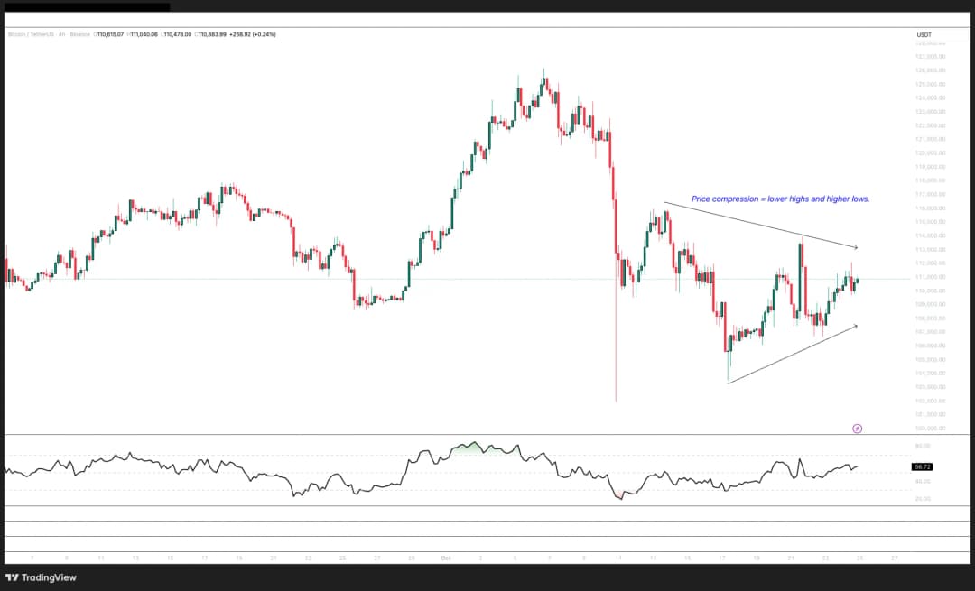 در تحلیل تکنیکال، معامله گران اغلب تأکید میکنند که «فشردگی قبل از گسترش» امری طبیعی است؛ وقتی نوسانات کاهش مییابد و قیمت ها پس از یک حرکت بزرگ بازار مانند فروش گستردهٔ 10 اکتبر که باعث کاهش 50 درصدی اوپن اینترست BTC شد، تثبیت میشوند، انتظار میرود قیمت برای یک جهش بزرگ آماده شود.