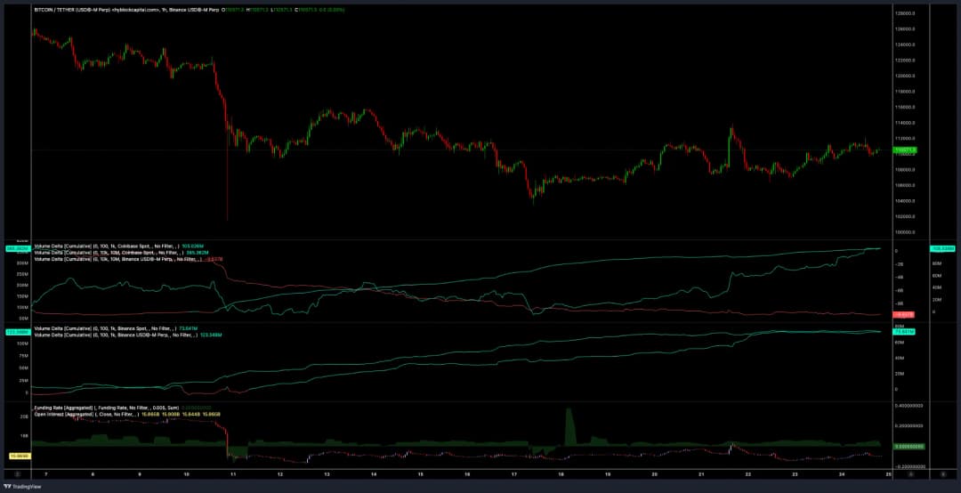 در زیر حرکت روزانه قیمت، چند رخداد مثبت وجود دارد که نشان میدهد BTC در نهایت ممکن است دوباره راه خود را تا محدوده 120,000 دلار باز کند. روز سه شنبه، صندوق های ETF اسپات بیت کوین 477 میلیون دلار جذب کردند در حالی که قیمت BTC از 107,500 دلار تا 114,000 دلار معامله شد. همراه با این جریان سرمایه، داده ها نشان میدهند خریداران اسپات در بازه های مختلف سفارش در صرافی های Binance و Coinbase در تمام محدوده قیمت از 101,500 دلار (Binance) تا سقف این هفته یعنی 114,000 دلار وارد بازار شده و خرید انجام داده اند.