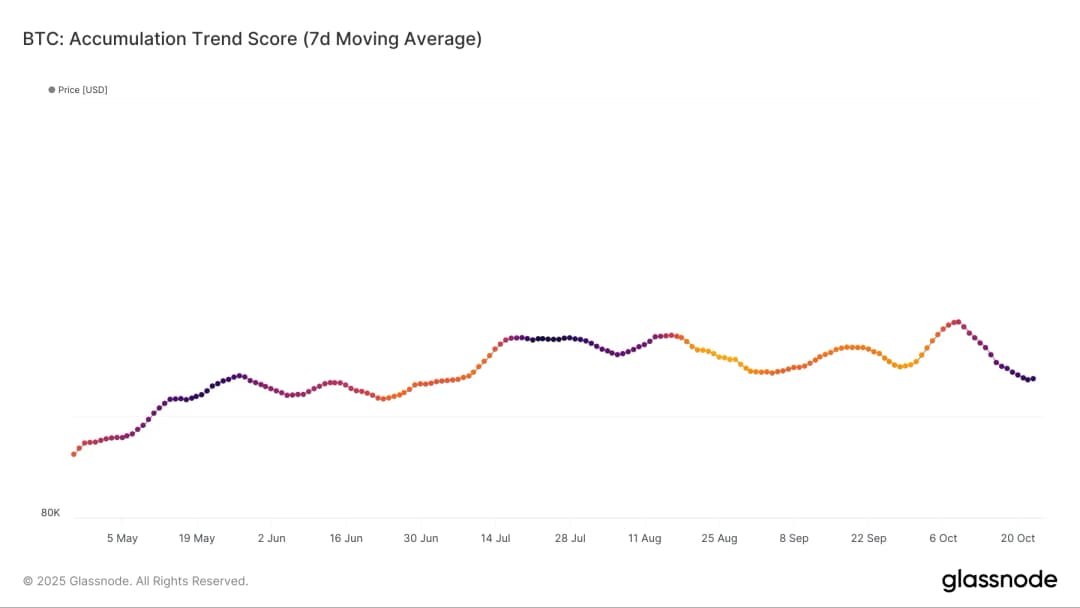 در حال حاضر، معیار Bitcoin Accumulation Trend Score از Glassnode نیز عدد 0.924 را نشان میدهد و ارائه دهنده داده های آنچین توضیح داده است که «نزدیک شدن نمره روند به 1 نشان میدهد که به طور کلی نهادهای بزرگتر (یا بخش بزرگی از شبکه) در حال انباشت هستند، و مقدار نزدیک تر به 0 نشان دهنده توزیع یا عدم انباشت است.» این عدد بالای 0.9 میتواند نشانه جمع آوری موضع توسط بازیگران بزرگ بازار باشد.