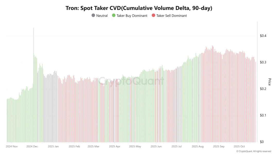 CVD گیرنده های اسپات از اواخر آگوست نزولی بوده است. این دوره، فاز غالبیت فروش گیرنده ها را منعکس می کرد. سفارش های گیرنده سفارش های بازار هستند که قیمت را حرکت می دهند و روندها را شکل می دهند. فروش تهاجمی در نمودار قیمت TRON منعکس شد.