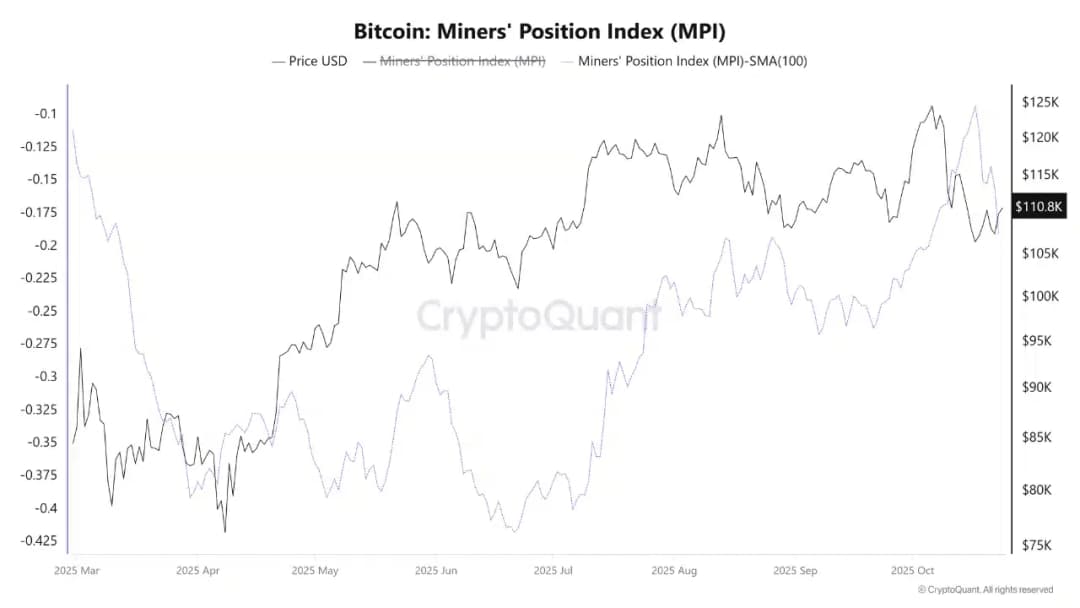در پستی در CryptoQuant Insights، تحلیلگر CryptoOnchain مشاهده کرد که شاخص موقعیت ماینرها (Miner’s Position Index یا MPI) نشان دهنده کاهش فشار فروش است. در واقع میانگین متحرک ساده ۱۰۰ روزه MPI به مقدار -0.12 رسید که نشان می داد ماینرها کمتر از میانگین ۱۰۰ روزه خود می فروشند. از ماه ژوئیه، MPI از کف های عمیق تر روند صعودی گرفته است که علامت تغییر ملایم از انباشت به فاز توزیع مداوم و خروج است تا اقدام به فروش تهاجمی.