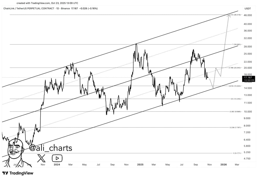 در پستی در X، تحلیلگر رمز ارز علی مارتینز نمودار قیمت LINK را منتشر کرد تا نشان دهد چرا احتمال دارد این آلتکوین به زودی تا ۱۵ دلار افت کند. ایده بر پایه یک کانال صعودی بود. طبق این تحلیل، LINK در مسیر رسیدن به کف کانال در حدود ۱۵ دلار قرار داشت که احتمالاً واکنش صعودی قوی ای از سوی بازار ایجاد خواهد کرد.