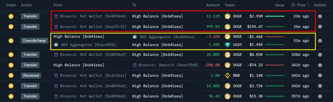 بر اساس .درون شبکه Lens، یک نهنگ غیرفعال DOGECOIN پس از ۱۱ ماه بازگشته و ۱۵.۱۱۵ میلیون DOGE معادل ۲.۹۵ میلیون دلار آمریکا را از Binance برداشت کرده است.