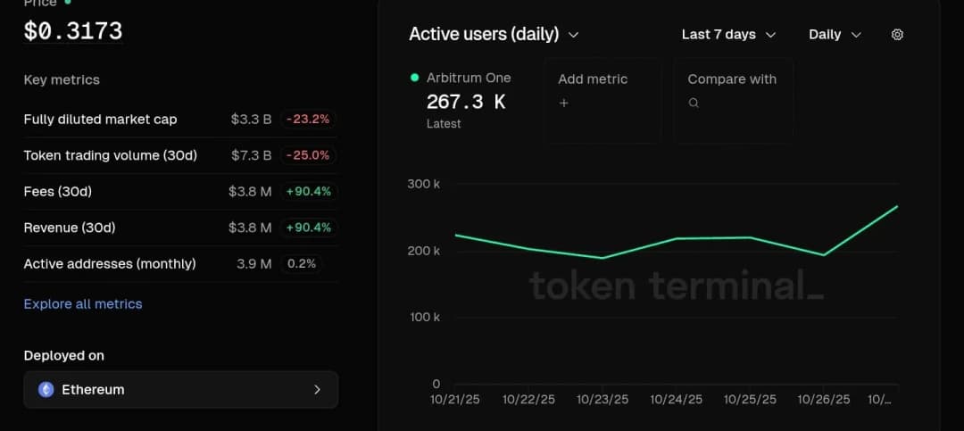 داده های Token Terminal نیز تایید کرد که کارمزدهای اپلیکیشن ها به بالاترین سطح شش ماهه رسیده است. شبکه در طول سی روز 3.8 میلیون دلار کارمزد و درآمد جمع آوری کرد که افزایش 90.4 درصدی را نشان می دهد. آدرس های فعال نزدیک به 3.9 میلیون باقی ماندند، در حالی که کاربران فعال روزانه به 267.3 هزار افزایش یافتند و ریزش اوایل هفته را معکوس کردند.