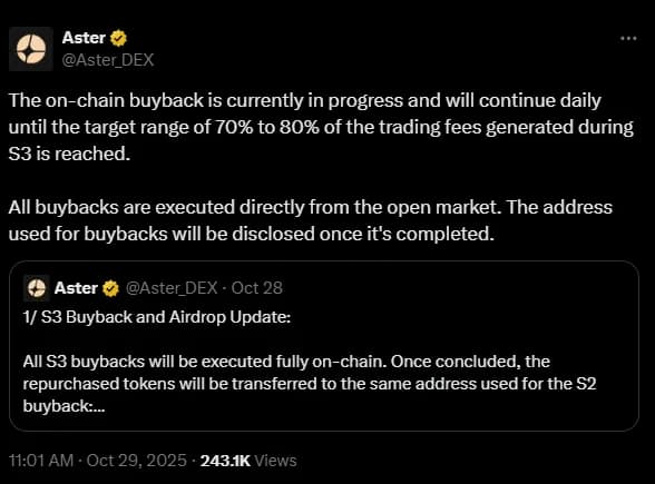 در روز 29 اکتبر، صرافی غیرمتمرکز دائمی پشتیبانی شده توسط YZi Labs گفت که تا 80% از کارمزدهای معاملاتی را برای پیشبرد برنامه بازخرید جدید اختصاص خواهد داد.  منبع: X