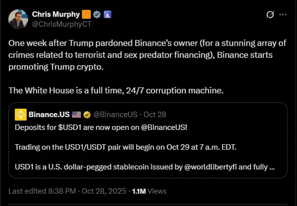 اما منتقدان این عفو را به عنوان یک سازوکار «پرداخت برای بازی» محکوم کردهاند. اقدام اخیر برای فهرست کردن USD1، تنها چند روز پس از پاردون، در Binance U.S. با تردیدها و اتهامات فساد روبهرو شده است. سناتور کریس مورفی این حرکت را شدیداً نقد کرد و کاخ سفید را «یک ماشین فساد تماموقت 24/7» خواند.