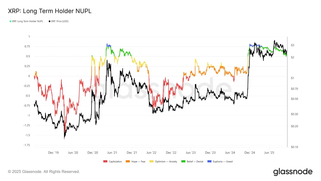 از سوی دیگر، شاخص NUPL هولدر بلند مدت از سطوح شیدایی که در اواخر ۲۰۲۴ رسید اصلاح شده است. به طور تاریخی، چنین سطوح بالای سود در میان سرمایه گذاران معمولاً دو بار در یک چرخه اتفاق نمی افتد. وقتی منطقه شیدایی رسید، قیمت معمولاً راهی جز افت نداشت. این چرخه کمی متفاوت بود — این معیار در ژوئیه به ۰.۷۴۸ رسید (نزدیک به سطوح شیدایی) که در آن زمان XRP تا ۳.۶۶ دلار رشد قیمتی داشت.
