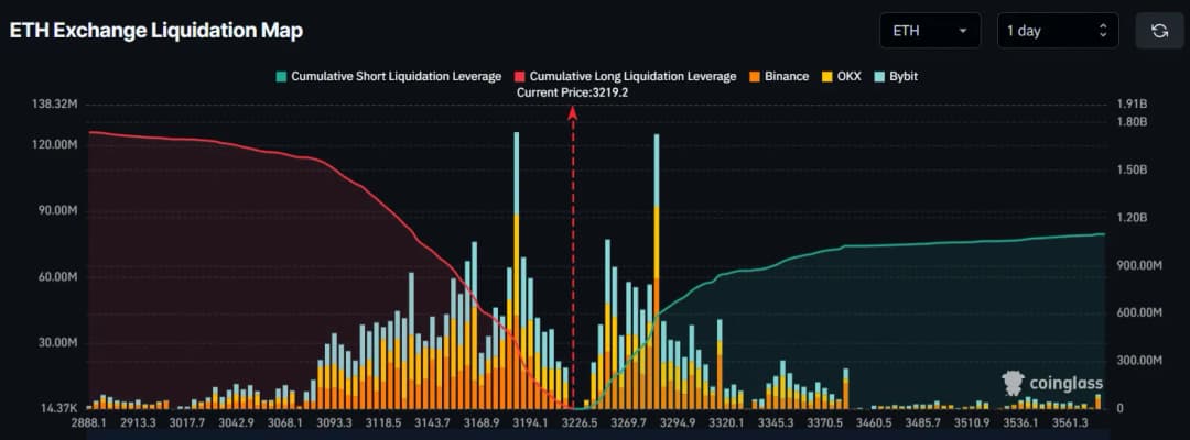 دادههای CoinGlass نشان داد خوشههای متراکم لیکوئید شدن در نزدیکی 3,186.9 دلار در سمت پایین و 3,284.1 دلار در سمت بالا قرار دارند. این سطوح به عنوان حمایت و مقاومت کوتاهمدت برای معاملهگران دارای اهرم عمل میکنند.