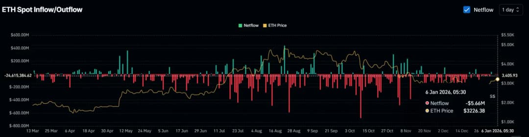 احساسات در سراسر بازار رمز ارزها تغییر کرد زیرا اتریوم بار دیگر توجه نهنگها و موسسات را به خود جلب کرد. این تغییر همزمان با خروج تازه از صرافیها و یک بریک اوت تکنیکال رخ داد و اتریوم را در کانون توجه قرار داد. بر اساس دادههای CoinGlass، در ۲۴ ساعت گذشته بیش از 5.66 میلیون دلار اتریوم از صرافیها خارج شده است که میتواند نشاندهنده انباشت باشد. قابل توجه است که این روند در سه روز متوالی ادامه داشته است، حتی در حالی که قیمت اتریوم روند صعودی را تجربه کرده است.