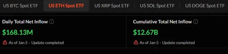 در همین زمان، ETF های اسپات اتریوم در ایالات متحده همچنان شاهد ورود نقدینگی مداوم بودند. بر اساس دادههای SoSoValue، در ۵ ژانویه ورود سرمایه چشمگیری به میزان 168.13 میلیون دلار ثبت شد. قابل توجه است که سهم بزرگ این ورود سرمایه به ETF اتریوم بلکراک، ETHA، با 102.90 میلیون دلار اختصاص داشت.