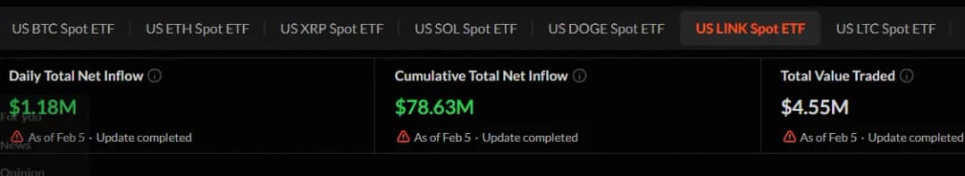 پلتفرم تحلیلی درون شبکه SoSoValue افشا کرد که در تاریخ ۵ فوریه ۲۰۲۶، صندوق های قابل معامله اسپات LINK در آمریکا ورودی ۱.۱۸ میلیون دلاری داشته اند. این ورود پول به ETFها نشان می دهد سرمایه گذاران وال استریت سرمایه جدیدی را به این صندوق ها تزریق کرده و در حال افزایش دسترسی خود به توکن های LINK هستند.