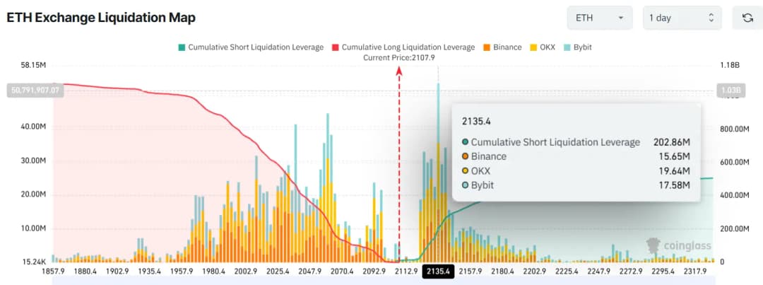 در زمان انتشار، قیمت ETH طی 24 ساعت 4.5٪ رشد کرده و این آلت کوین حوالی 2,108 دلار معامله می شد. با وجود افزایش قیمت و احتمال انباشت نهنگ ها، بازیگران بازار همچنان در تعامل با این توکن مردد هستند؛ که می توان از کاهش 35٪ در حجم معاملات تا 34.35 میلیارد دلار این بی میلی را مشاهده کرد.