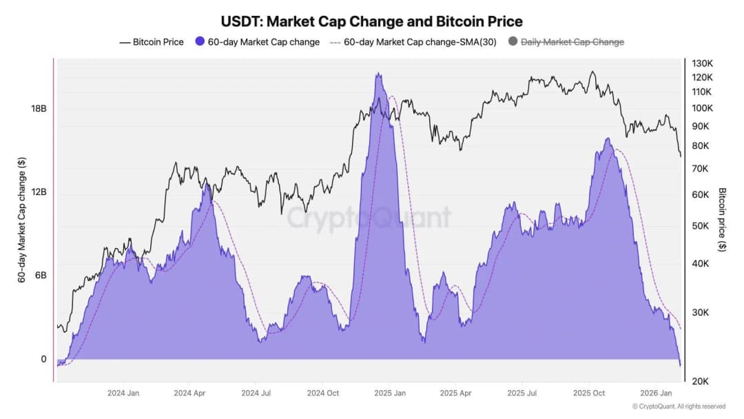 بر زمینه پر از FUD موجود، نگرانی های اخیر از تعطیلی تنها فشار را روی سرمایه گذاران بیت کوین افزایش می دهد. در این شرایط، تبدیل شدن ظرفیت بازار USDT به منفی نشان می دهد نقدینگی از سیستم خارج می شود نه اینکه برای یک حرکت ریسک پذیری فوری موقعیت بگیرد.