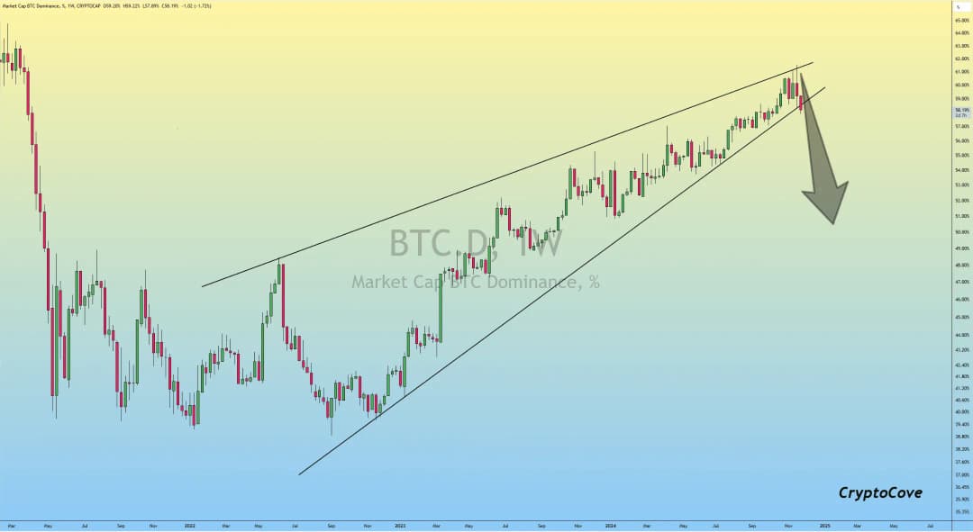 در روزهای اخیر، بیت کوین در محدوده ۹۶ هزار دلار در حال تثبیت بوده است که این امر باعث کاهش شدید نوسانات آن شده است. این کاهش نوسانات به یک تحول مهم دیگر نیز منجر شده است. Captain Faibik، تحلیلگر محبوب کریپتو، اخیراً در توییتی به این موضوع اشاره کرد. به گفته او، سلطه بیت کوین از ابتدای سال ۲۰۲۲ در یک الگوی کنج صعودی در حال حرکت بود. اخیراً، این نمودار به سمت پایین از این الگو خارج شده است که نشاندهنده افزایش قیمت آلتکوینها است. در واقع، Captain Faibik حتی به فصل آلتکوینها در سالهای ۲۰۲۴-۲۰۲۵ اشاره کرد.