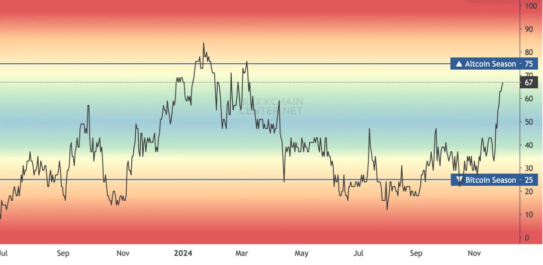 کاهش سلطه بیت کوین در واقع به آلتکوینها کمک میکند تا سهم بازار خود را افزایش دهند. همانطور که قبلاً توسط AMBCrypto گزارش شده بود، بسیاری در حال گمانهزنی هستند که ممکن است فصل جدیدی برای آلتکوینها در راه باشد. در حالی که احتمال وقوع این اتفاق در سال ۲۰۲۵ بیشتر است، روند اخیر رویدادها نشان میدهد که ممکن است زودتر از حد انتظار رخ دهد. در واقع، ممکن است این اتفاق همین حالا آغاز شده باشد. به عنوان مثال، اتریوم، پادشاه آلتکوینها، در ۲۴ ساعت گذشته صعودی بوده و قیمت آن بیش از ۳٪ افزایش یافته است. سایر آلتکوینهای با ارزش بازار بالا نیز عملکردهای امیدوارکنندهای داشتهاند. در صدر این لیست، XRP با افزایش بیش از ۱۲٪ در ۲۴ ساعت گذشته قرار دارد. علاوه بر این، تحلیل AMBCrypto نشان داد که شاخص فصل آلتکوینها به شدت افزایش یافته و در زمان نگارش این گزارش به ۶۷ رسیده است. برای مقایسه، عدد نزدیک به ۷۵ نشاندهنده فصل آلتکوینها است.