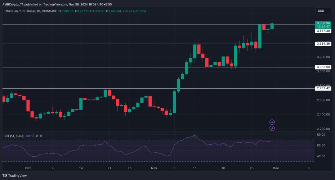 طبق نمودار روزانه این آلتکوین، در زمان نگارش این گزارش در حال آزمایش مقاومت خود بود. با این حال، مشکل این بود که شاخص قدرت نسبی (RSI) آن در حال ورود به منطقه اشباع خرید بود. این موضوع ممکن است باعث فروش گسترده شود و از افزایش بیشتر قیمت جلوگیری کند. پیشبینی قیمت اتریوم (ETH) ۲۰۲۴-۲۰۲۵ بنابراین، در حالی که اکثر شاخصها و شرایط بازار نشاندهنده فصل آلتکوینها هستند، هنوز مشخص نیست که آیا این اتفاق در کوتاهمدت رخ خواهد داد یا خیر.