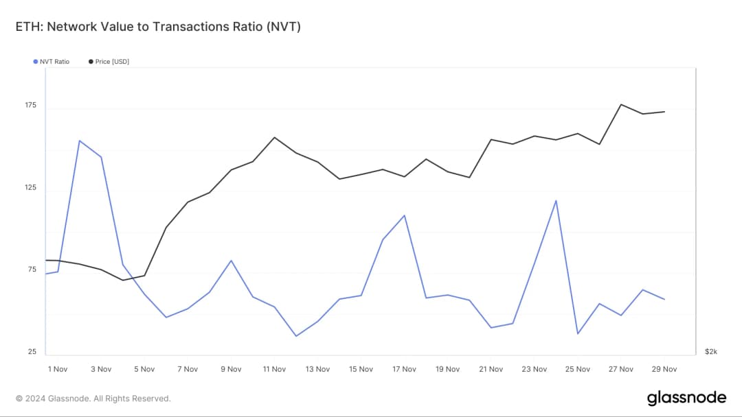 از آنجا که اتریوم برترین آلتکوین بازار است، AMBCrypto قصد دارد آن را بررسی کند تا ببیند آیا دادههای درون زنجیرهای آن نشاندهنده یک روند صعودی پایدار است یا خیر. ارزیابی این موضوع میتواند به شناسایی فصل آلتکوینهای پیش رو کمک کند. با وجود افزایش اخیر قیمت، نسبت NVT اتریوم پایین باقی مانده است. کاهش این شاخص به معنای کمارزش بودن دارایی است که نشاندهنده افزایش پایدار قیمت است.