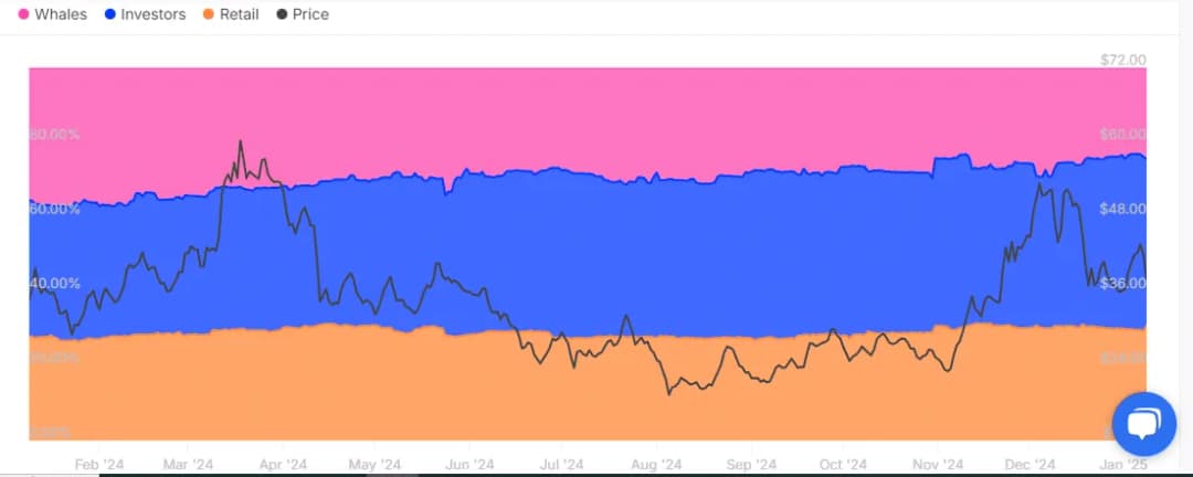 دارایی سرمایهگذاران از ۴۹.۵۹ میلیون سکه (۴۵.۶۵٪) به ۴۷.۰۶ میلیون سکه (۴۷.۷۸٪) کاهش یافته است. خردهفروشان نیز داراییهای خود را از ۳۲.۵۱ میلیون AVAX (۲۹.۹۳٪) به ۳۲.۴۳ میلیون AVAX (۳۰.۸۷٪) کاهش دادهاند. دادههای تمرکز تاریخی خروج سرمایه از همه دستههای قدیمیتر را تأیید میکند و نشان میدهد که سرمایهگذاران با احتیاط عمل میکنند.
