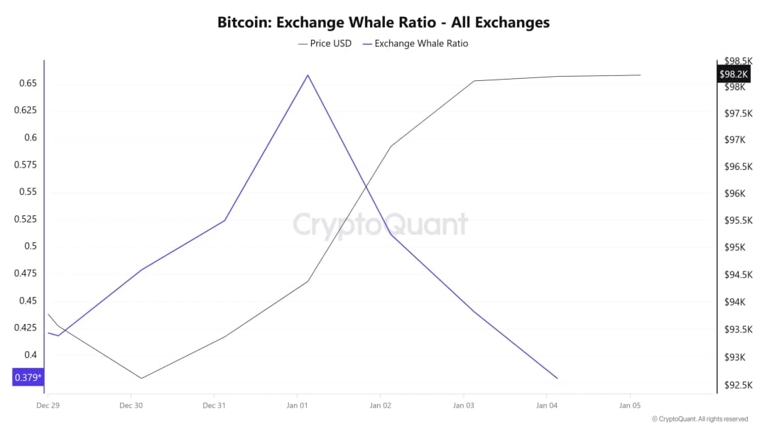 این روند انباشت با کاهش نسبت نهنگهای صرافیها نیز تأیید میشود. عرضه نهنگها به صرافیها به ۰.۳۷ کاهش یافته است که نشاندهنده رفتار نگهداری (HODL) است. نهنگها در حال انتقال توکنهای BTC خود به کیف پولهای خصوصی هستند که نشاندهنده احساسات صعودی است زیرا آنها انتظار افزایش بیشتر را دارند. به طور خلاصه، کاهش تقاضای سرمایهگذاران خرد به دارندگان بزرگ فرصت داده است تا بیت کوین را با قیمتهای پایینتر انباشت کنند. این شرایط بیت کوین را برای افزایشهای بیشتر در آینده آماده میکند. بنابراین، اگر شرایط فعلی بازار حفظ شود، BTC به ۹۸,۷۰۰ دلار بازخواهد گشت. حرکت به بالای این سطح بیت کوین را برای بازپسگیری ۱۰۰ هزار دلار تقویت میکند. در مقابل، یک اصلاح دیگر میتواند BTC را به ۹۶,۱۰۰ دلار کاهش دهد.