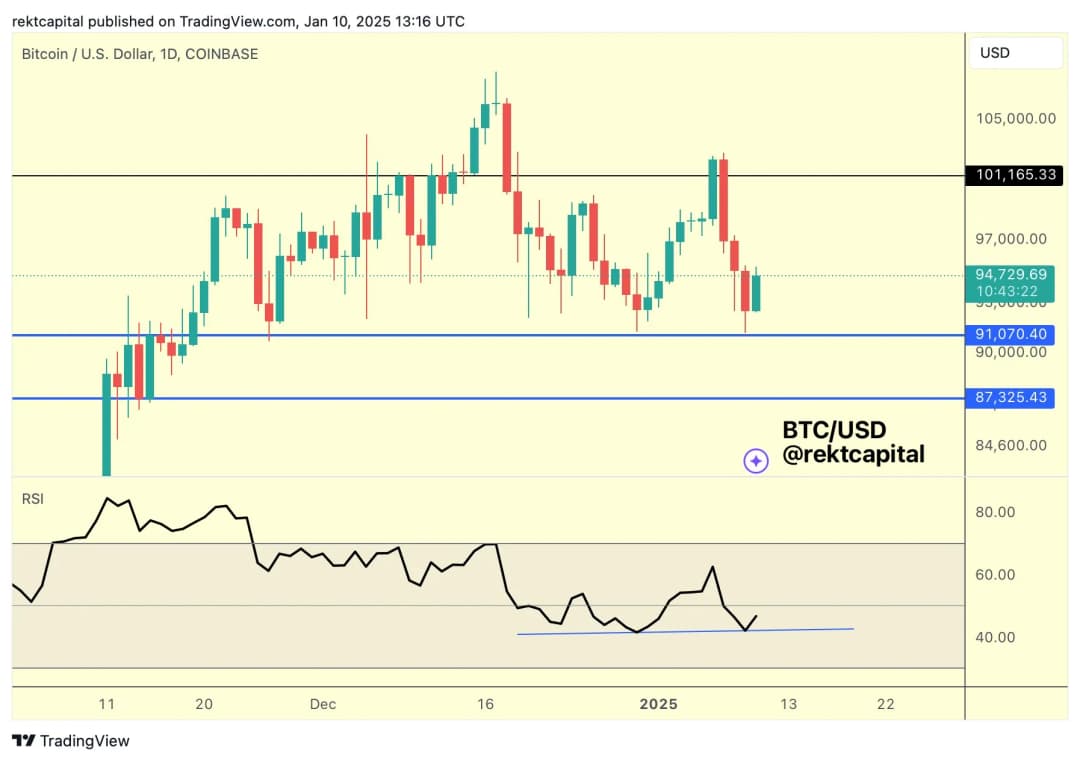 تحلیلگر دیگری به نام Rekt Capital دیدگاه مثبتی داشت. او با تحلیل نمودار روزانه، به وجود یک واگرایی صعودی در شاخص قدرت نسبی (RSI) بیت کوین اشاره کرد. پیشتر، Cointelegraph گزارش داده بود که RSI ساعتی به پایینترین سطح خود از ابتدای اکتبر رسیده است. او در همان روز گزارش داد: «بیت کوین در حال نشان دادن علائم واگرایی صعودی در حمایت محدوده ۹۱۰۰۰ دلار است.»