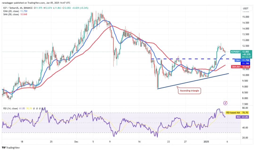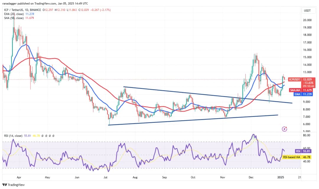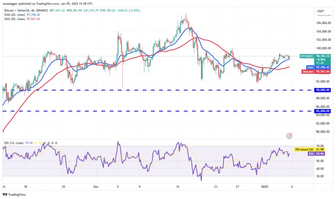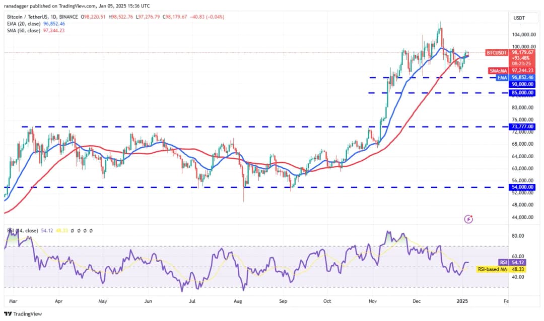با این حال، در کوتاهمدت، تحلیلگران Bitfinex به Cointelegraph گفتند که بیت کوین ممکن است تا پایان ژانویه بین ۹۵,۰۰۰ تا ۱۱۰,۰۰۰ دلار نوسان کند. آنها انتظار ندارند که مراسم تحلیف دونالد ترامپ در ۲۰ ژانویه به عنوان یک رویداد افزایش قیمت قابل توجه عمل کند. اگر بیت کوین به بالای ۱۰۰,۰۰۰ دلار برسد، آلتکوینهای منتخب نیز ممکن است افزایش یابند. بیایید به نمودارهای ۵ ارز دیجیتال برتر که ممکن است در کوتاهمدت عملکرد بهتری داشته باشند، نگاهی بیندازیم.