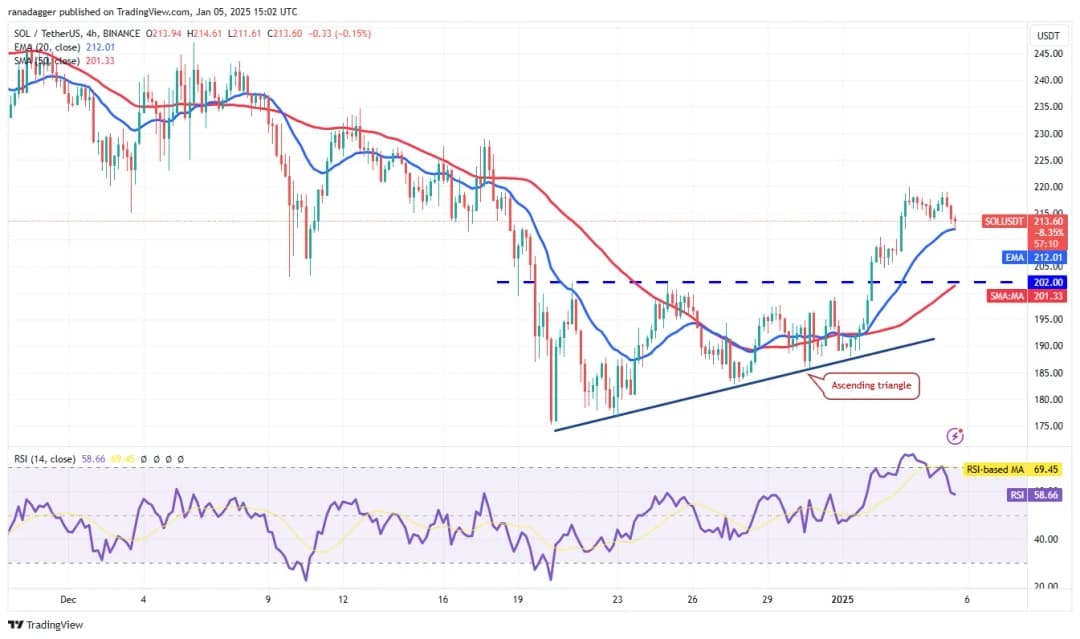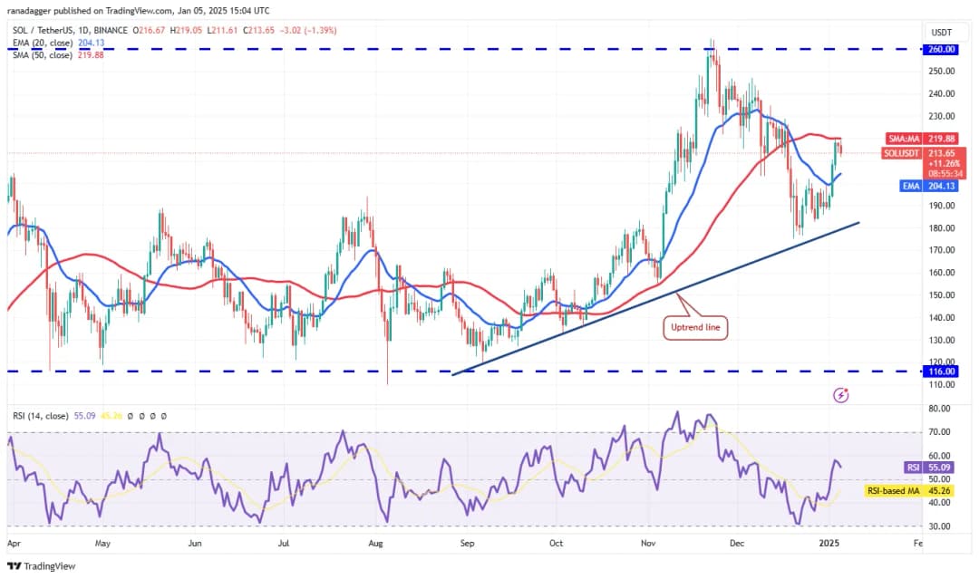میانگین متحرک نمایی ۲۰ روزه (۲۰۴ دلار) شروع به صعود کرده و RSI در منطقه مثبت است که نشاندهنده برتری خریداران است. اگر قیمت از سطح فعلی یا میانگین متحرک نمایی ۲۰ روزه بازگردد، خریداران دوباره سعی خواهند کرد جفت SOL/USDT را به بالای میانگین متحرک ۵۰ روزه برسانند. اگر موفق شوند، قیمت ممکن است به ۲۳۴ دلار و سپس به ۲۴۷ دلار برسد. این دیدگاه مثبت در صورت کاهش قیمت به زیر میانگین متحرک نمایی ۲۰ روزه نقض میشود و قیمت ممکن است به خط روند صعودی کاهش یابد.