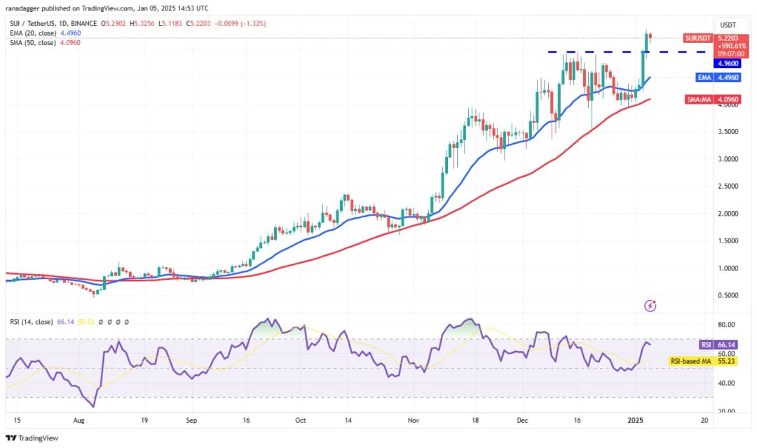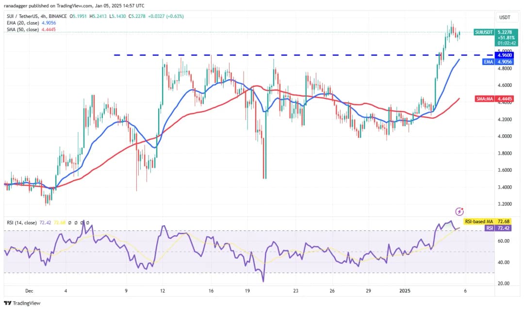 فروشندگان سعی خواهند کرد خریداران تهاجمی را با کاهش قیمت به زیر سطح شکست ۴.۹۶ دلار به دام بیندازند. اگر موفق شوند، جفت SUI/USDT میتواند به میانگین متحرک نمایی ۲۰ روزه (۴.۴۹ دلار) کاهش یابد. فروشندگان باید قیمت را به زیر ۳.۹۴ دلار برسانند تا نشان دهند که ممکن است سقف قیمت در کوتاهمدت تشکیل شده باشد. در مقابل، بازگشت قوی از ۴.۹۶ دلار نشان میدهد که خریداران سعی دارند این سطح را به حمایت تبدیل کنند و ممکن است روند صعودی به سمت ۶.۲۸ دلار آغاز شود.