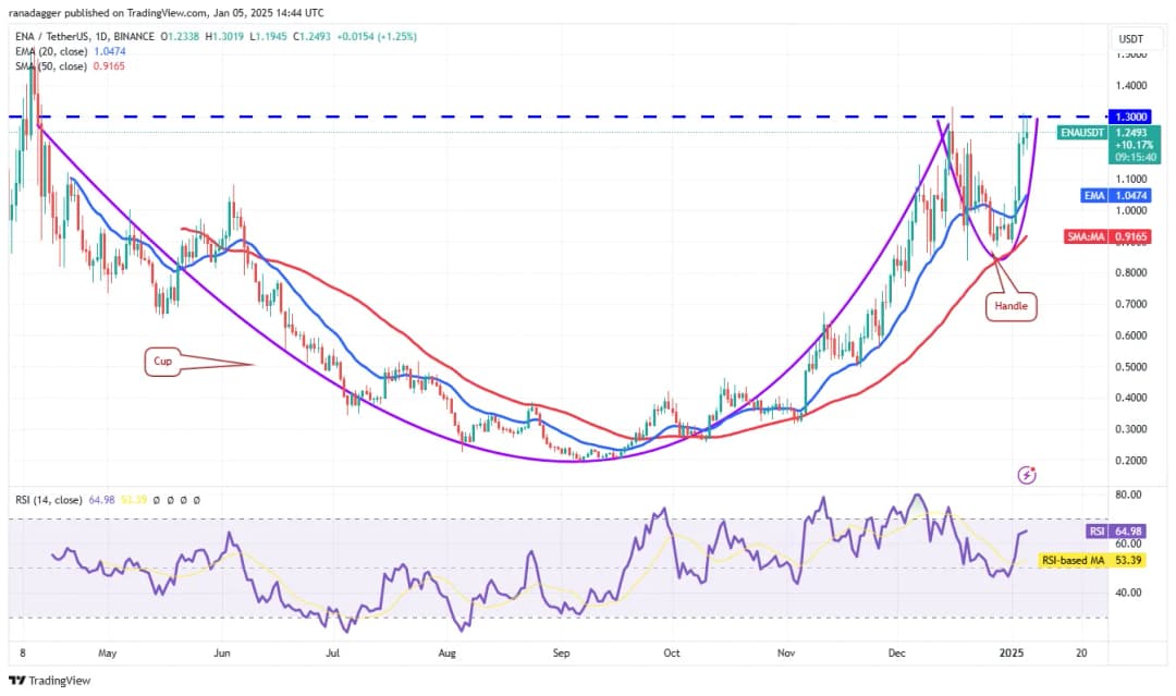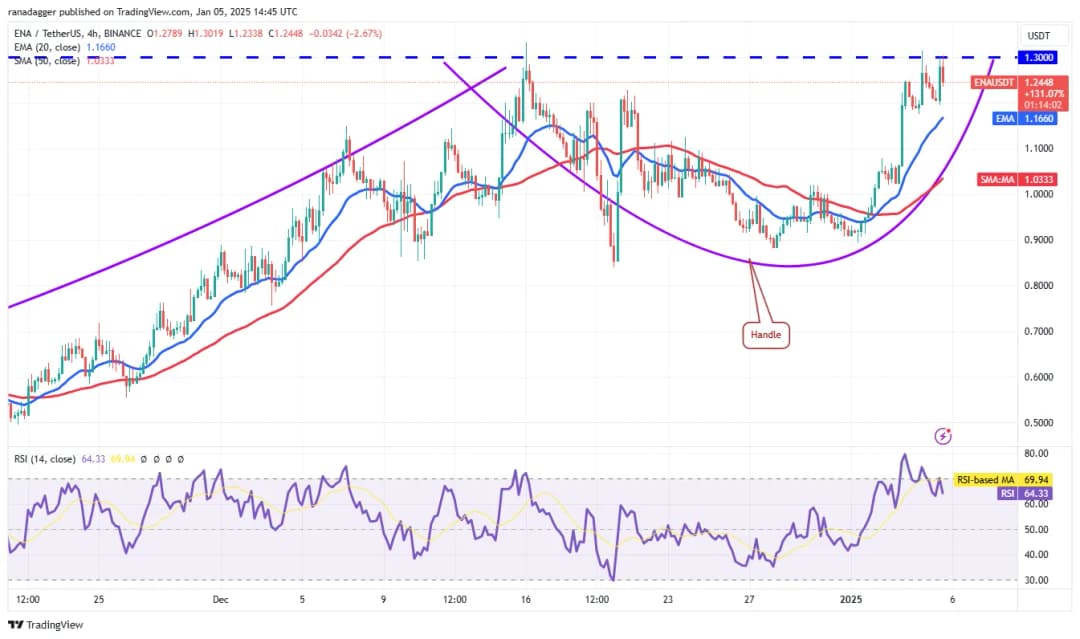 میانگین متحرک نمایی ۲۰ روزه (۱.۰۴ دلار) شروع به صعود کرده و RSI در منطقه مثبت است که نشاندهنده برتری خریداران است. اگر خریداران قیمت را به بالای ۱.۳۰ دلار برسانند، جفت ENA/USDT میتواند به ۱.۵۲ دلار و سپس به ۱.۷۲ دلار برسد. هدف الگوی صعودی بسیار بالاتر و در ۲.۴۱ دلار است. حمایت در نزول در ۱.۱۰ دلار و سپس در میانگین متحرک نمایی ۲۰ روزه قرار دارد. شکست و بسته شدن قیمت زیر میانگین متحرک نمایی ۲۰ روزه نشان میدهد که خریداران کنترل را از دست میدهند و قیمت ممکن است به ۰.۸۸ دلار کاهش یابد.