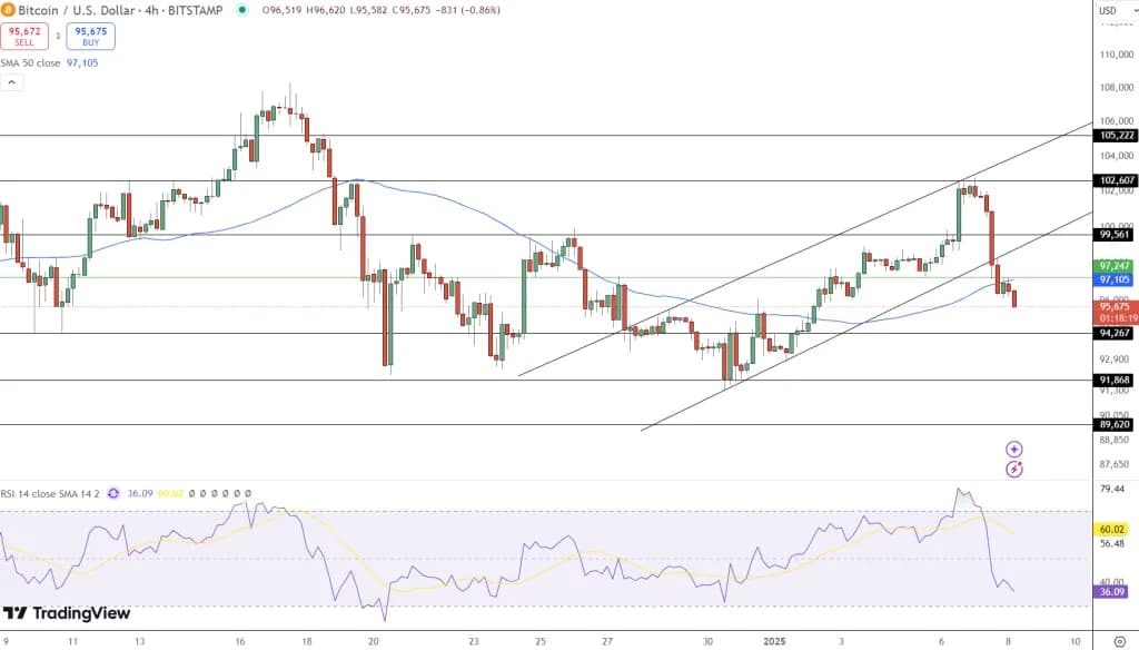 قیمت بیت کوین (BTC) در ۲۴ ساعت گذشته نزدیک به ۶ درصد کاهش یافته و به ۹۵,۸۰۰ دلار رسیده است. این کاهش پس از یک بازگشت نزولی شدید اتفاق افتاد. شکست سطح حیاتی ۹۷,۲۰۰ دلار، روند صعودی اخیر را نقض کرد و تشکیل الگوهای "پنس بالا" و "انگلفینگ نزولی" نشاندهنده احتمال کاهش بیشتر قیمت است. حمایت فوری در ۹۴,۲۶۷ دلار قرار دارد و سطوح پایینتر در ۹۱,۸۶۸ و ۸۹,۶۲۰ دلار هستند. از سوی دیگر، مقاومت در ۹۷,۲۴۷ دلار و سپس ۹۹,۵۶۱ و ۱۰۲,۶۰۷ دلار قرار دارد. شاخص RSI در ۳۶، شرایط اشباع فروش را نشان میدهد، اما احساسات نزولی همچنان غالب است و میانگین متحرک ۵۰ روزه در ۹۷,۱۰۵ دلار به عنوان مقاومت دینامیک عمل میکند.