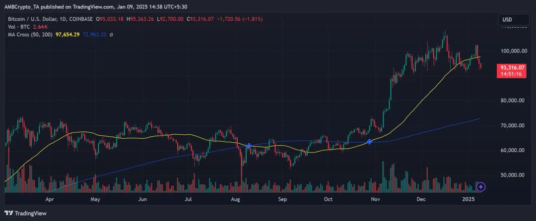 حرکات قیمتی بیت کوین نیز احساسات محتاطانه موجود در بازار مشتقات را منعکس میکند. در زمان نگارش این گزارش با قیمت ۹۳,۳۱۶ دلار معامله میشود و زیر میانگین متحرک ۵۰ روزه خود به مبلغ ۹۷,۶۵۴ دلار قرار گرفته است که نشاندهنده یک چرخش نزولی در کوتاهمدت است. در عین حال، میانگین متحرک ۲۰۰ روزه در ۷۲,۹۶۲ دلار به عنوان یک سطح حمایت مهم بلندمدت عمل میکند.