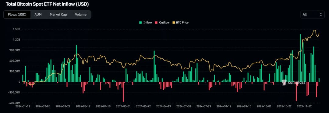 در مقایسه این دو رمزارز، صحبت درباره ETFهای آنها ضروری است، زیرا این موضوع یکی از پر بحثترین مسائل در سال ۲۰۲۴ بوده است. جالب اینجاست که هر دو رمزارز در این زمینه عملکرد فوقالعادهای داشتهاند. در جریان افزایش شدید قیمت BTC و ETH، ورود سرمایه به ETFهای آنها به رکوردهای جدیدی رسید. به طور دقیق، ورود سرمایه به ETF بیت کوین در ۷ نوامبر از ۱.۳ میلیارد دلار عبور کرد.