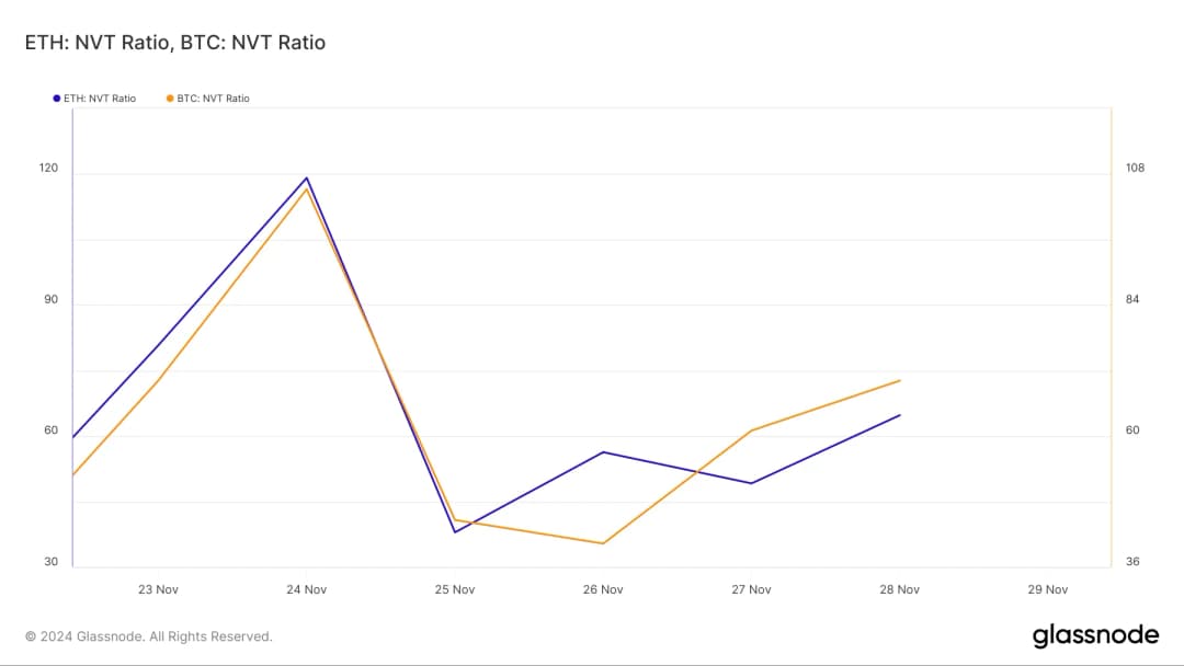 در ادامه، هر دو رمزارز با یک مشکل مواجه بودند. به عنوان مثال، نسبت NVT بیت کوین افزایش یافت. افزایش مشابهی نیز در نمودار اتریوم مشاهده شد. این موضوع نشان میدهد که هر دو رمزارز بیش از حد ارزشگذاری شدهاند و احتمال اصلاح قیمت در کوتاهمدت وجود دارد.