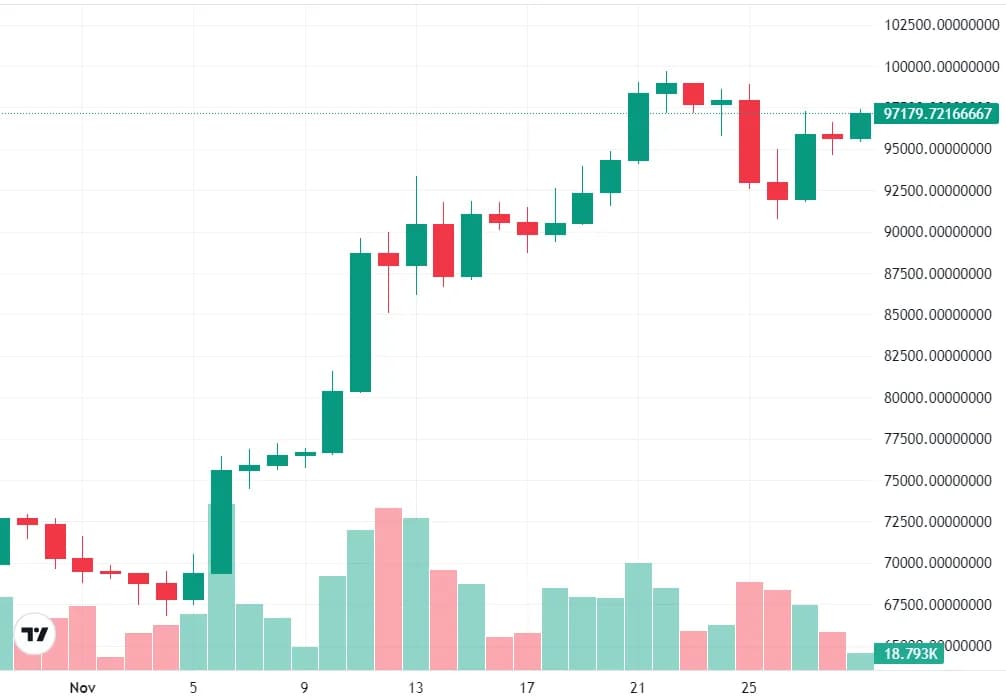 علیرغم پیشبینیهای ناامیدکننده، بیت کوین بیش از ۵.۹٪ از ۹۲,۰۰۰ دلار بهبود یافت و تا ساعت ۱۲:۱۵ بعد از ظهر به وقت هماهنگ جهانی در ۲۹ نوامبر، از ۹۷,۵۰۰ دلار عبور کرد.