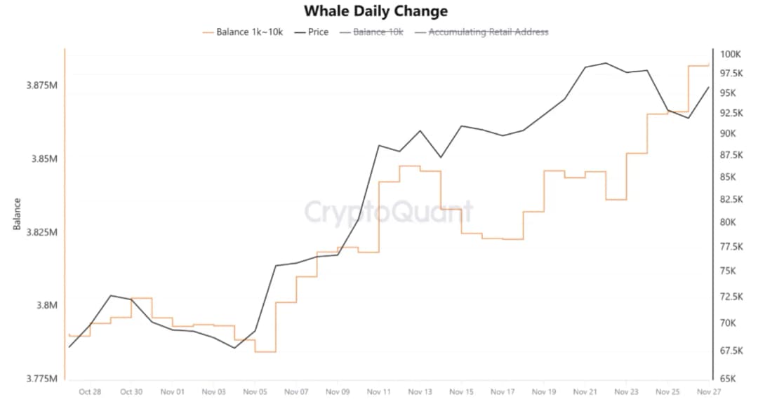 «نهنگهای بیت کوین از اصلاح بازار کریپتو در اوایل این هفته استفاده کردند و ۱۶,۰۰۰ بیت کوین خریداری کردند»، تحلیلگر CryptoQuant، Caueconomy، نوشت. او در یک پست در ۲۹ نوامبر در X (توییتر سابق) گفت که بخش زیادی از این ۱.۵ میلیارد دلار بیت کوین پس از آن خریداری شد که تقریباً ۴ میلیارد دلار بیت کوین توسط دارندگان کوتاهمدت با ضرر به صرافیها ارسال شد.