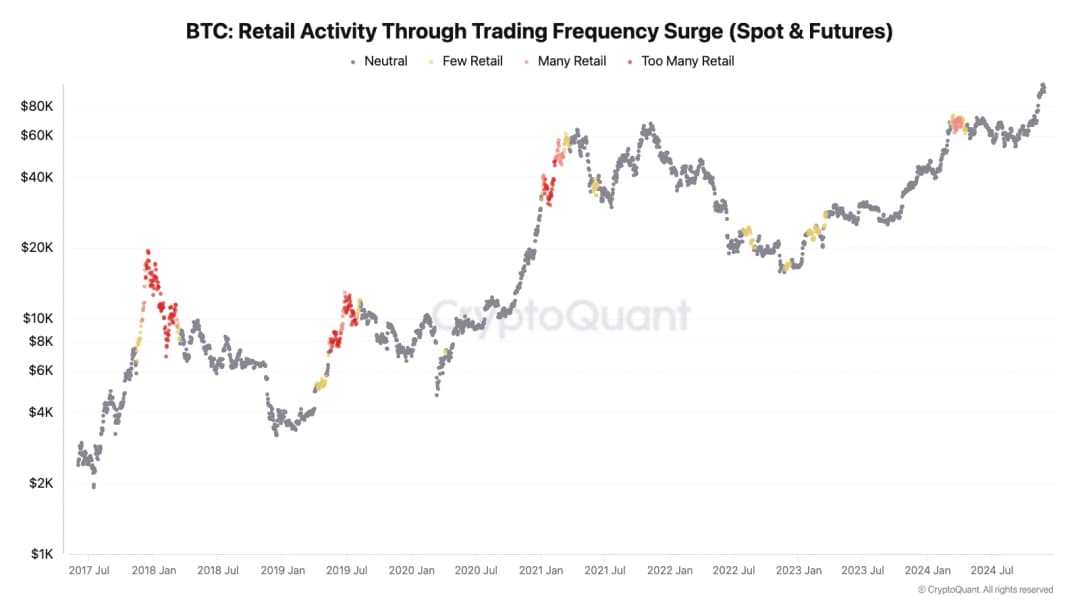 در اکتبر، Cointelegraph گزارش داد که دارایی نهنگهای بیت کوین به اوج تاریخی ۶۷۰,۰۰۰ بیت کوین رسید. این اتفاق قبل از افزایش قیمت بیت کوین از سطوح ۶۰,۰۰۰ دلار به اوجهای تاریخی فعلی زیر ۱۰۰,۰۰۰ دلار رخ داد. اگر تاریخ تکرار شود، قیمت بیت کوین باید از انباشت نهنگها بهرهمند شود تا از سد روانی ۱۰۰,۰۰۰ دلار عبور کند.