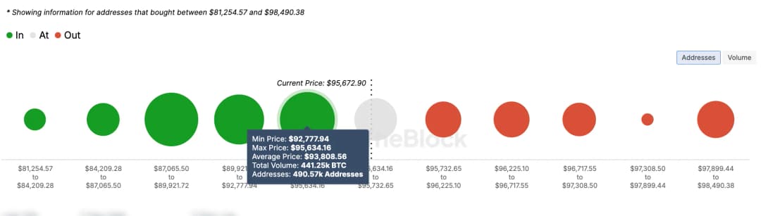 در قیمت ۹۵,۶۷۲ دلار، بیت کوین از نظر حمایتی در موقعیت قویتری نسبت به مقاومتهای پیش رو قرار دارد. طبق دادههای IntoTheBlock، نمودار «در سود/زیان بودن در اطراف قیمت» (IOMAP) نشان میدهد که حمایت فوری در محدوده ۹۲,۷۷۷ تا ۹۵,۶۳۴ دلار قرار دارد، جایی که حدود ۴۹۰,۵۷۰ کیف پول تقریباً ۴۴۱,۲۵۰ بیت کوین خریداری کردهاند.