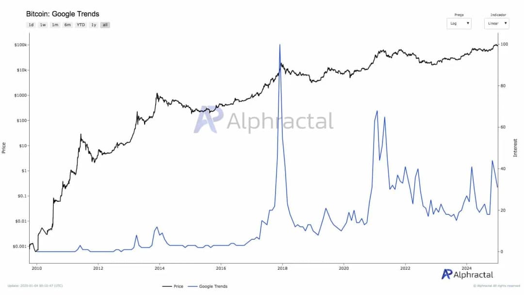 علاوه بر این، علاقه جدید بازار به بیت کوین، که توسط Google Trends ردیابی میشود، با کاهش قیمت این دارایی به زیر ۱۰۰ هزار دلار به شدت کاهش یافت. به طور تاریخی، افزایش در Google Trends همیشه با هیجان و اصلاحات یا اوجهای بالقوه بازار همراه بوده است.
