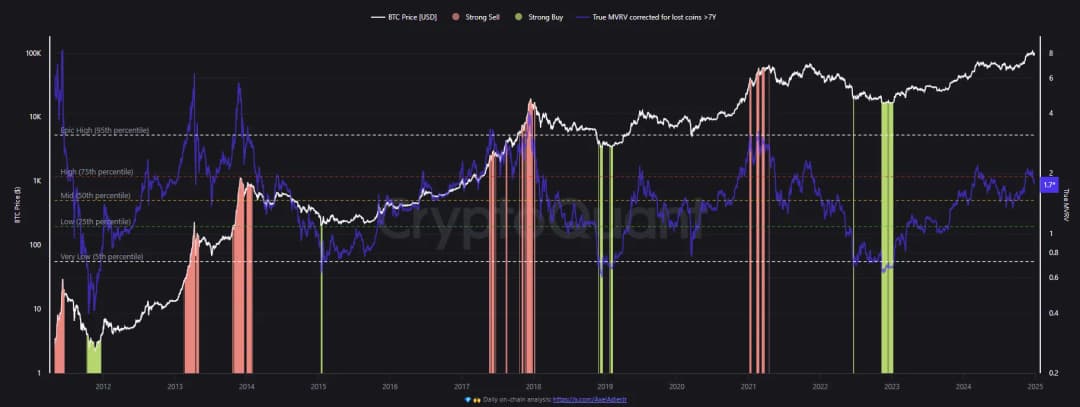 این دیدگاه توسط شاخص True MVRV (ارزش بازار به ارزش تحققیافته واقعی) که برای سنجش ارزشگذاری بیت کوین و ردیابی چرخه بازار استفاده میشود، تأیید شد.
